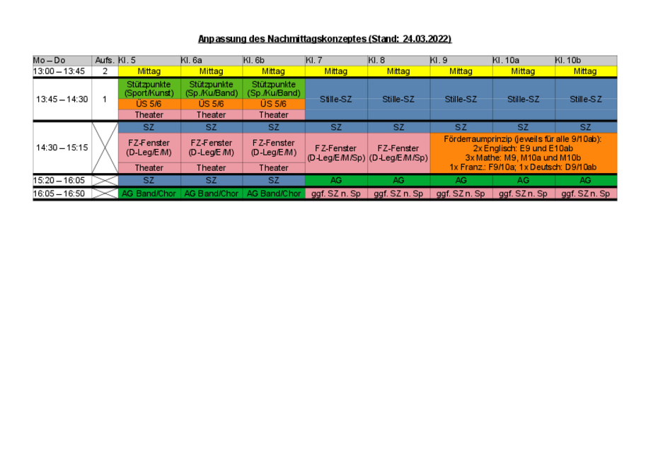 Die Schüler der Jahrgangsstufen 5 und 6 können sich somit die Mittagspause im Zeitfenster von 13:00 bis 14:30 Uhr von Montag bis Donnerstag selbst gestalten. Im Anschluss daran findet die Studierzeit sowie andere Förderangebote bis 16.00 Uhr statt. Am Freitag gilt ein Sonderplan, nachdem die Mittagspause bereits um 13:30 Uhr endet und von einem Angebot an unterschiedlichen Kursen bis 14:15 Uhr gefolgt wird.